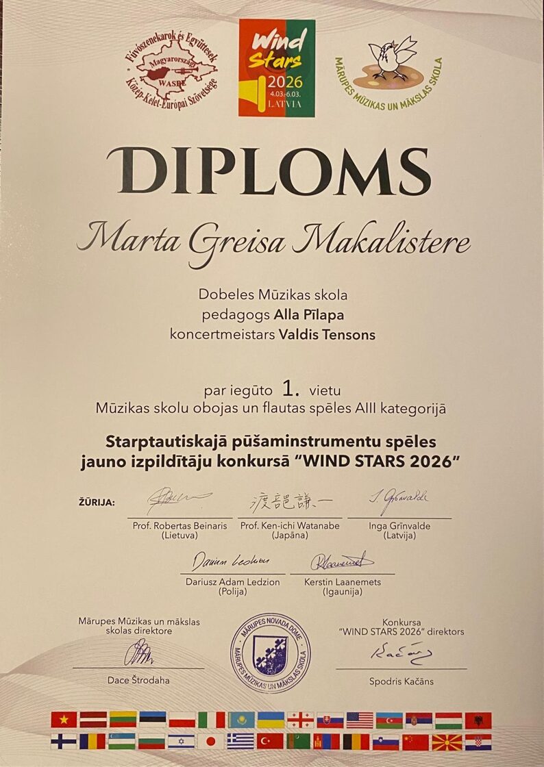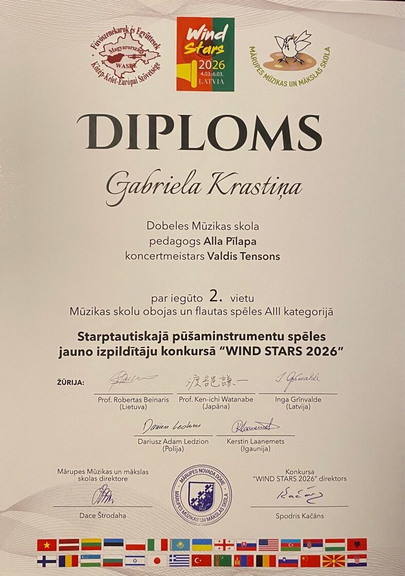 No 4. līdz 6.martam Mārupē norisinājās Starptautiskais pūšaminstrumentu konkurss "Wind Stars 2026", kurā Dobeles Mūzikas skolu pārstāvēja divas flautistes - ped . Alla Pīlapas audzēknes Marta Greisa Makalistere (3.klase) un Gabriela Krastiņa (5.klase) un koncertmeistars Valdis Tensons.Martai Greisai Makalisterei 1.vieta un Gabrielai Krastiņai - 2.vieta!